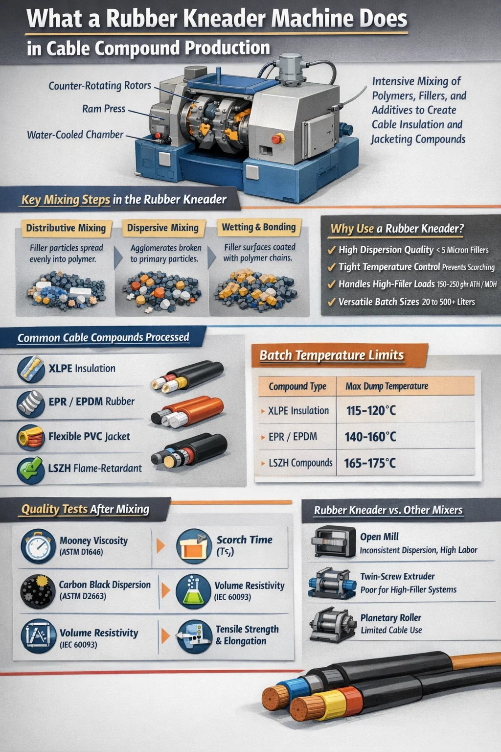 | خمیر لاستیک (Internal Mixer) | کیفیت پراکندگی بالا، اندازه دسته ای انعطاف پذیر، کنترل دما محکم، ترکیبات پرکننده بالا را کنترل می کند | فرآیند دسته ای، نیاز به ورق بندی پایین دستی دارد | اکثر انواع ترکیب کابلی |