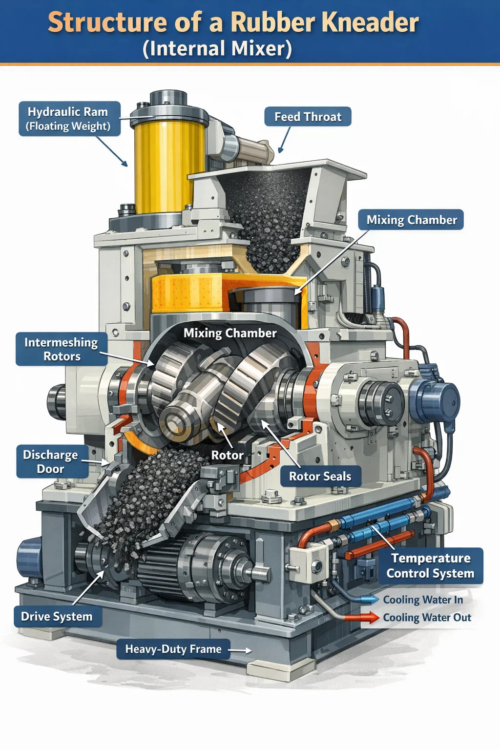 ساختار هسته یک خمیر لاستیکی از شش سیستم اصلی تشکیل شده است: محفظه اختلاط، روتورها، قوچ هیدرولیک (وزن شناور)، مکانیزم درب تخلیه، سیستم کنترل دما و سیستم محرک. هر کدام نقش مکانیکی مشخصی را ایفا می کنند و درک نحوه تعامل آنها نشان می دهد که چرا خمیرگیرهای داخلی به استاندارد صنعتی برای ترکیب لاستیک در تولید لاستیک، مهر و موم، واشر، شیلنگ و کالاهای لاستیکی فنی تبدیل شده اند.