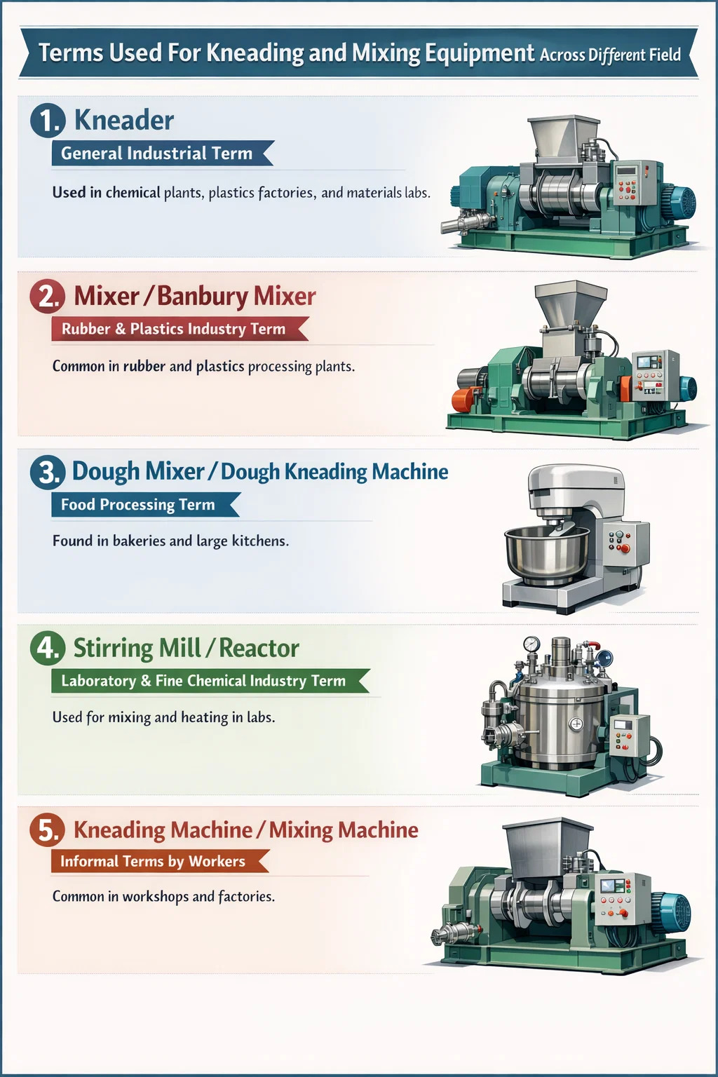 با توجه به تجهیزاتی مانند "دستگاه های خمیر زن" یا "خمیر زن"، نام های استفاده شده برای آنها در زمینه ها و صنایع مختلف بسیار متفاوت است. اگرچه عملکرد اصلی آنها مخلوط کردن مواد از طریق ورز دادن قدرتمند است، نام هایی که افراد استفاده می کنند بسته به کاربرد به طور قابل توجهی متفاوت است.